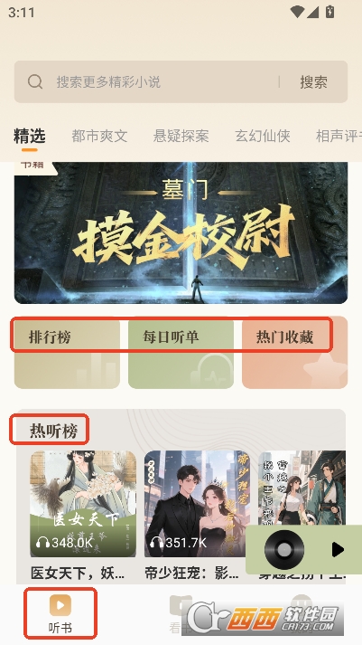电子书阅读器app官方正式版是一款非常好用的在线听书阅读工具,汇集了海量的热门书籍资源,涵盖都市爽文,悬疑探案,玄幻仙侠,相声评书,次元青春,影视剧场等题材分类,每日更新丰富的听单推荐,热听榜单,TOP排行。点击听书就能进入收听模式,可设置倍速与定时,还能选章切换,满足不同用户的听书阅读需求。