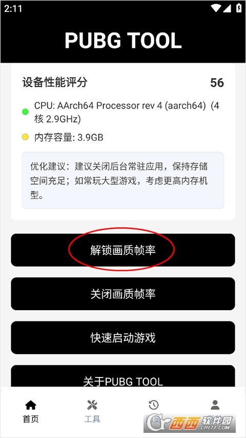 1、手机提前安装好和平精英游戏,然后打开NSS画质助手,在首页点击解锁画质帧率