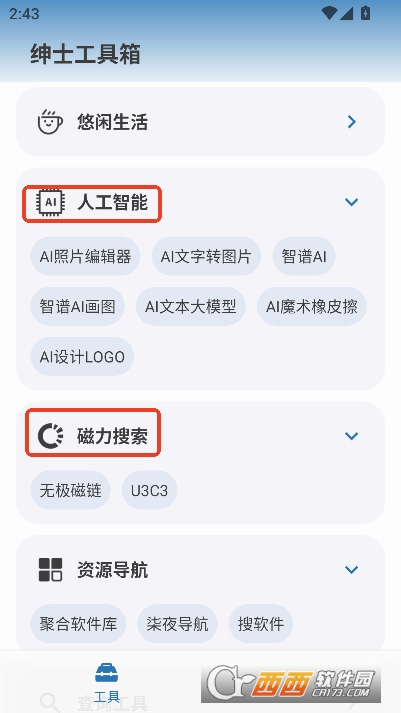绅士工具箱app安卓纯净版是一款便捷实用的多功能工具合集,涵盖悠闲生活 ,人工智能,磁力搜索,资源导航,查询工具,游戏娱乐等多领域,每个分类下都有丰富的快捷功能入口,点击就能直接跳转使用。还能设置软件的背景主题,显示与亮度,打造专属的自定义工具,随时清理内容,满足不同用户的使用需求。