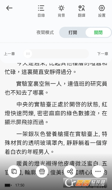 1、界面设置: 在阅读界面点击屏幕中央,调出菜单,进入“设置”选项,根据当前环境光线调整到最舒适的阅读模式。