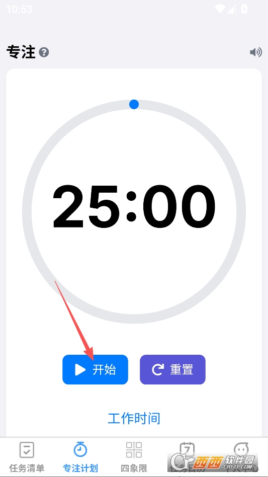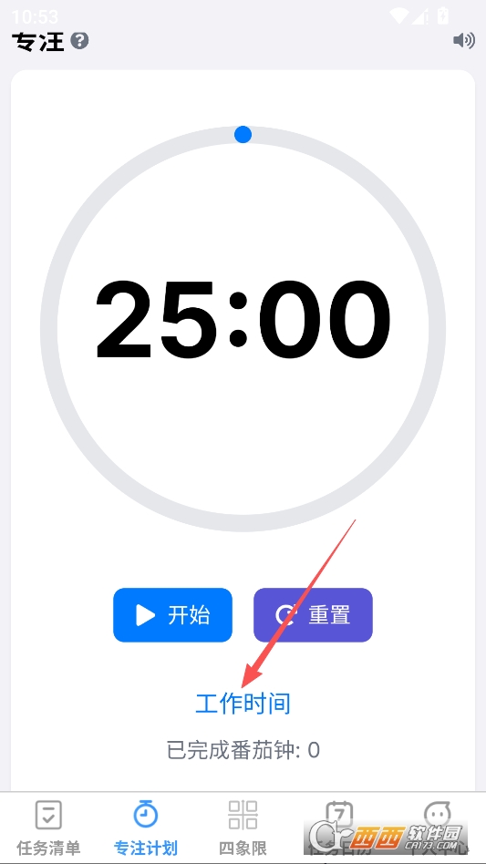 就能找到番茄钟了,也就是专注时钟,点击下方工作时间按钮可以切换工作和休息时间