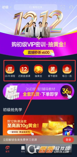 3、首页展示了覆盖26个年度的系统课程资源、近期安排的直播课程、按章节划分的题库以及每日推荐练习等核心学习内容。