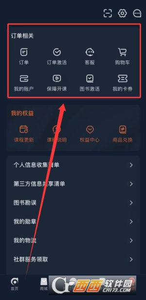 4、我的个人中心能够管理所有购买订单、进行课程激活操作、联系客服咨询、查看购物车商品、管理账户信息并确认课程保障开课状态。