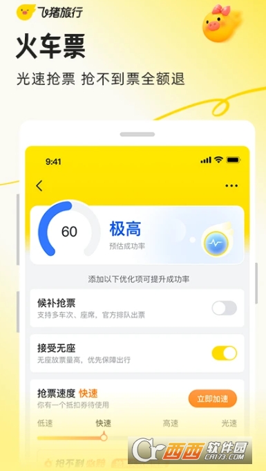 72种智能抢票策略:覆盖火车票预约抢票、实时捡漏、VIP加速等多元场景,支持多车次、多座席候补抢票,可选择接受无座以提升成功率,官方承诺抢不到票全额退款,搭配飞猪 + 12306 双重积分福利,让火车票购票成功率翻倍,解决节假日购票难痛点。