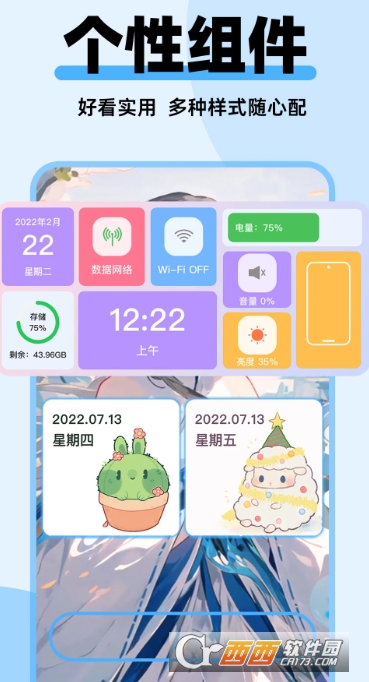 风格品类极致丰富:涵盖涂鸦、二次元、梦幻水彩、简约线性等多元风格,主题、壁纸、组件等资源均为精选原创,更新频率稳定。每类资源都经过严格筛选,画质高清无水印,原创内容占比高,能有效避免与同类软件资源同质化,满足用户对独特性的追求。