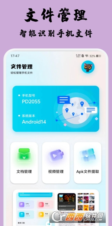 轻量化智能文件管理:支持文档、视频等多类型文件分类管理,还能精准提取手机内 Apk 安装包,搭配智能文件识别技术,可快速筛选定位目标文件,操作路径简洁直观,有效提升文件整理与查找的效率。