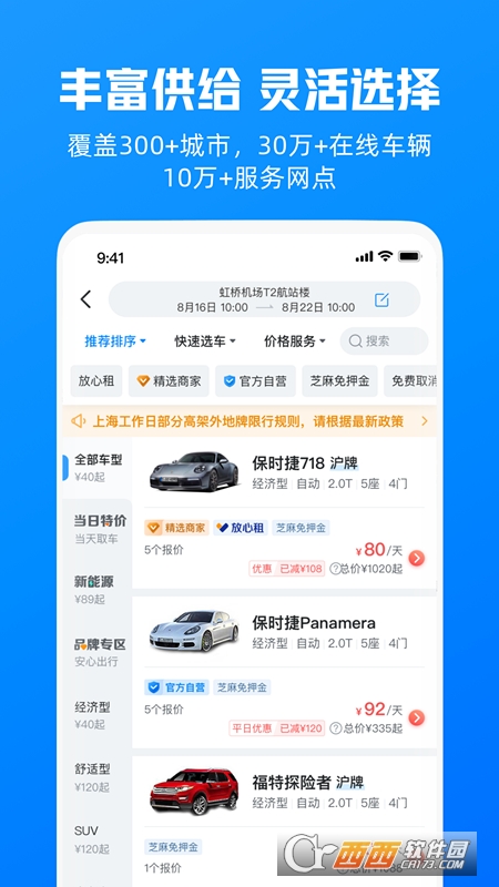 哈啰租车APP的界面设计简洁清晰,功能分区明确,租车流程指引直观易懂。就算是第一次使用租车软件的新手,也能快速找到选车、下单、验车等核心功能入口,轻松完成整个租车流程。平台车源十分丰富,汇聚了1000多个汽车品牌、60000多种车型,在线车辆超过250000辆。从经济型轿车、宽敞的SUV,到高端豪华车、低碳电动车,再到商务车、房车等特殊车型,应有尽有。服务网点覆盖广泛,100%覆盖全国各大机场和火车站,同时深入各大城市的核心区域。支持异地取还车和送车上门服务,无论你是刚下飞机还是在家门口,都能便捷取还车,极大提升了出行灵活性。