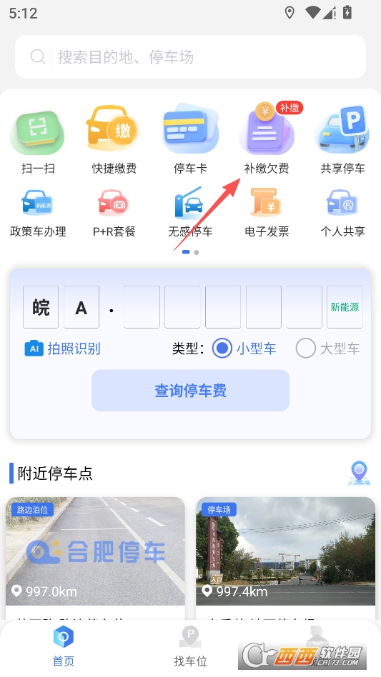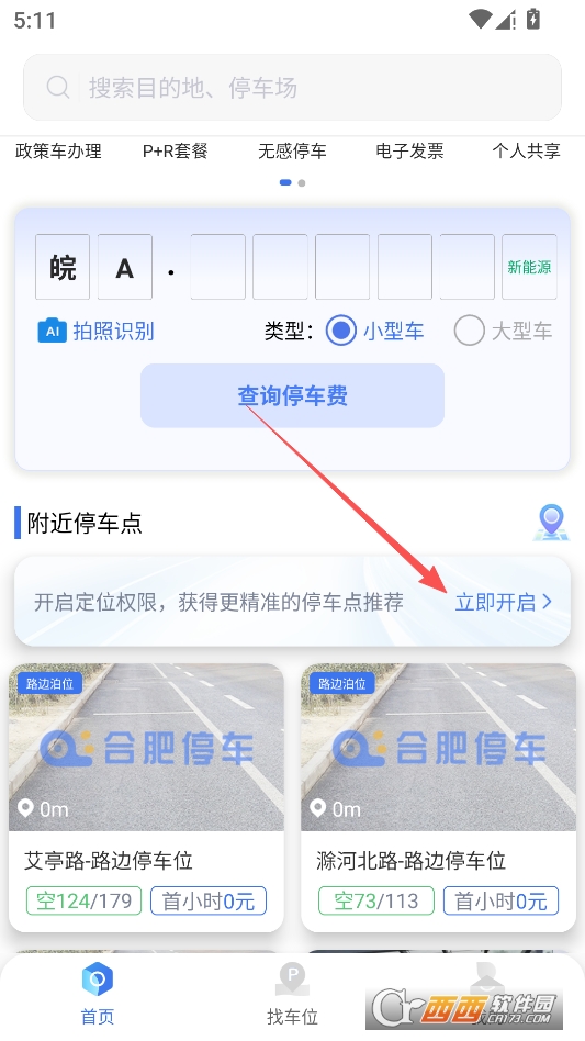 进入软件主页后下拉屏幕,找到附近停车场功能,提供所需定位权限
