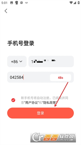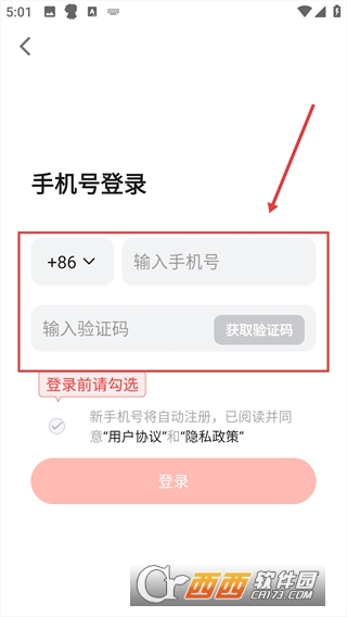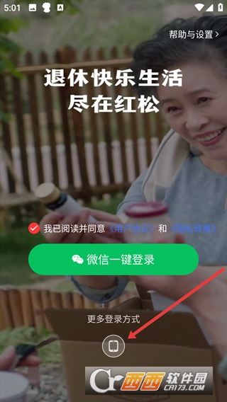 1、在红松登录页面,点击手机号图标,进入手机号登录界面。
