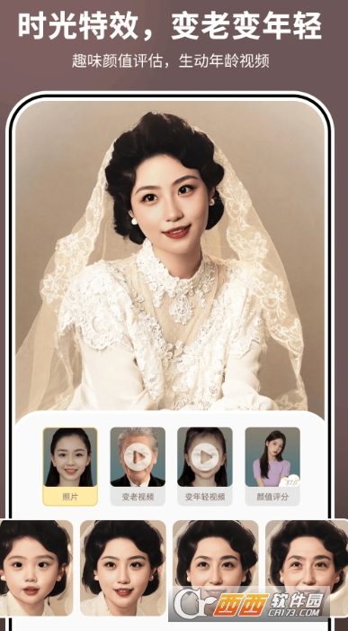 全场景趣味转换:除基础的一键变老 / 变年轻、性别互换外,还可实现静态照片转动态 GIF(还原往昔场景)、照片变卡通(含情侣头像定制、迪士尼公主等风格),同时支持宠物变身、黄金比例脸评估等特色功能,玩法丰富多元。