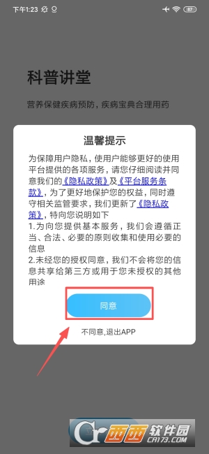 1、于温馨提示弹窗内点击"同意",代表接受相关隐私政策与服务条款。