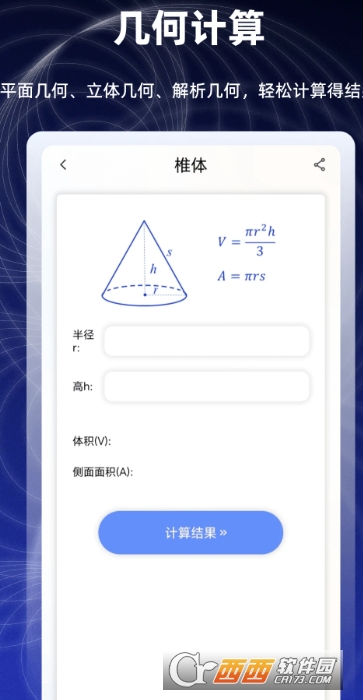 多维度几何计算:覆盖平面、立体、解析三类几何计算,包含 19 种几何体公式,能精准计算体积、面积等关键参数,适配数学学习与工程设计场景。无论是学生解题时的平面几何运算,还是工程师设计中的立体结构分析,都能提供清晰计算过程与准确结果,无需手动推导复杂公式。