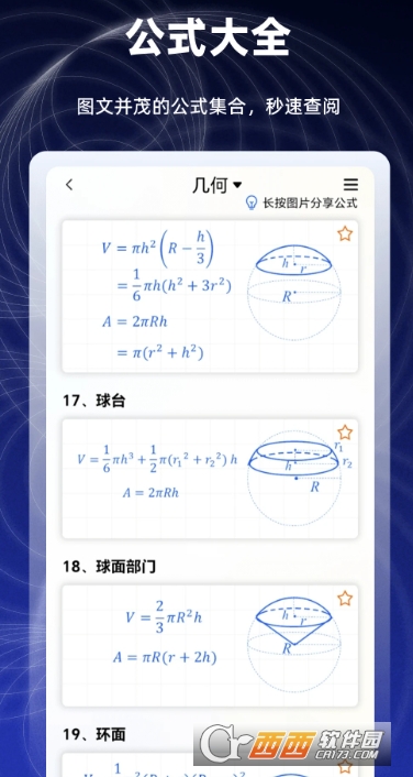 图文公式大全:聚合各类数学公式,搭配图形展示,支持秒速查阅与长按分享,解决公式记忆与查找难题。公式按几何、微积分等类别分类整理,标注清晰且附带应用场景说明,用户无需翻阅厚重教辅资料,即可快速找到所需公式并直接应用于计算。