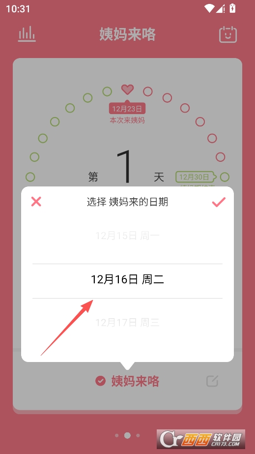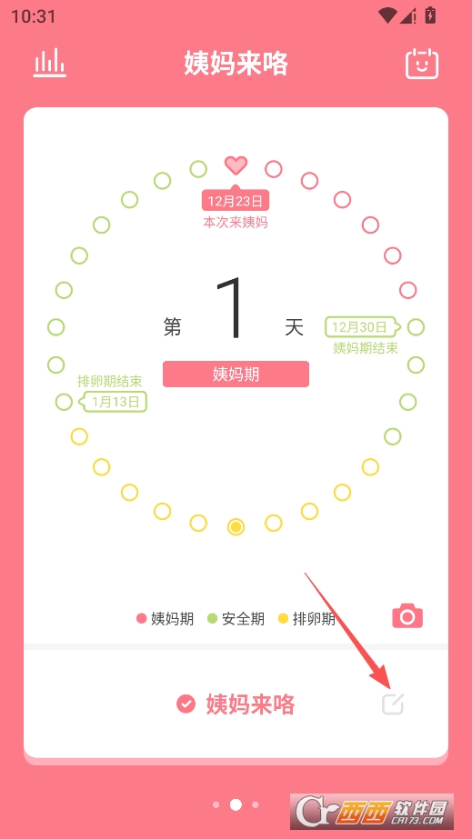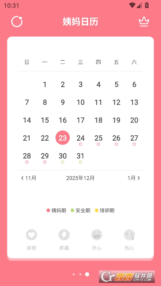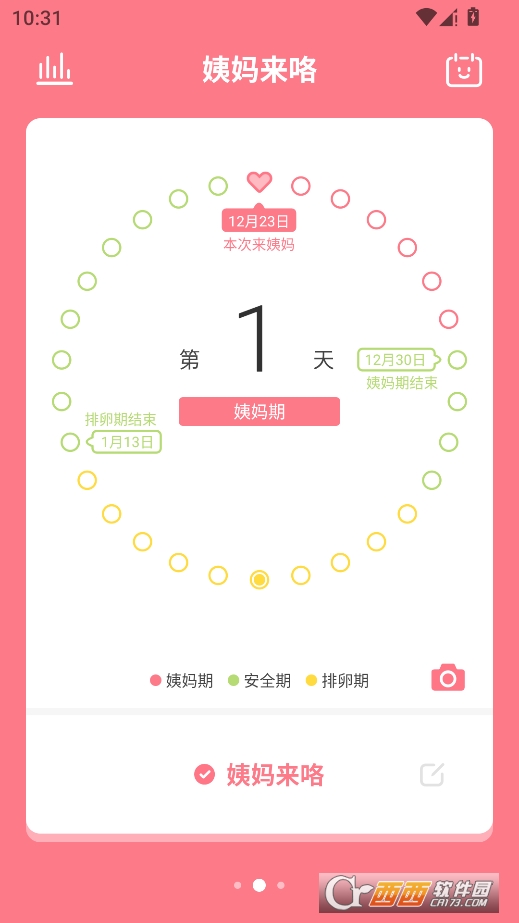 3. 直观的周期展示方式,采用独特的圆盘设计呈现整个生理周期。当前所处的生理阶段一目了然,同时支持日历模式查询,可轻松翻阅历史记录的姨妈日期和未来预测的经期时间,规划生活更方便。