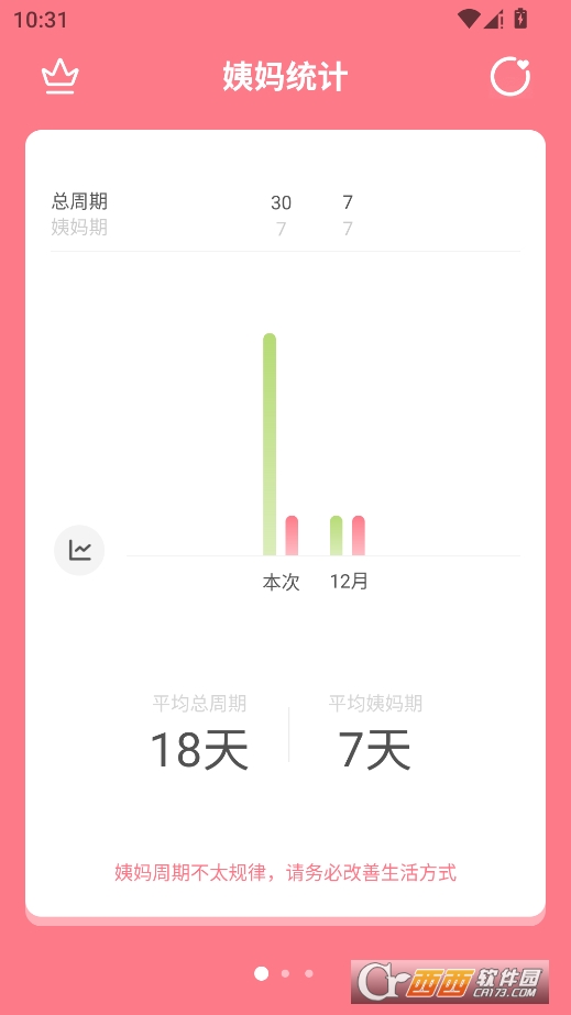 2. 精准记录与数据分析,支持设置生理周期时间、记录每月经期起止日期和身体状况。系统会自动计算每次周期变化的时间,生成条状统计图表,还能计算半年平均周期,清晰呈现经期规律。
