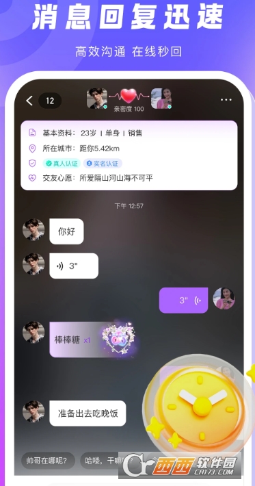 在功能设计上,平台覆盖多场景交友需求,不仅支持基于精准定位的附近交友,让同城邂逅更便捷;还推出语音速配、视频速配等特色功能,用户可凭借声音、真人形象快速锁定同频好友,大幅提升匹配效率。同时,多样化的沟通方式满足不同互动阶段需求,图文搭讪、语音畅聊、视频见面循序渐进,搭配24小时消息实时推送,让高效沟通无间断。