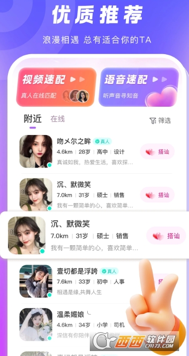 多模式精准匹配:支持附近交友、语音速配、视频速配三种核心匹配方式,可按位置、声音、真人形象快速锁定契合对象,满足不同场景交友需求。搭配在线筛选功能,能精准过滤不符合期望的用户,大幅降低无效沟通,让交友更具针对性。