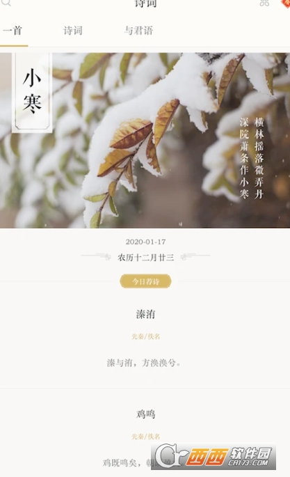 智能主题推荐:每日结合节气时令(如小寒、新年)推送对应主题诗词,同时根据用户浏览、收藏习惯生成个性化推荐列表,通过算法持续优化内容匹配度,让经典诗词与现代生活场景自然融合,满足用户碎片化、场景化的学习需求。