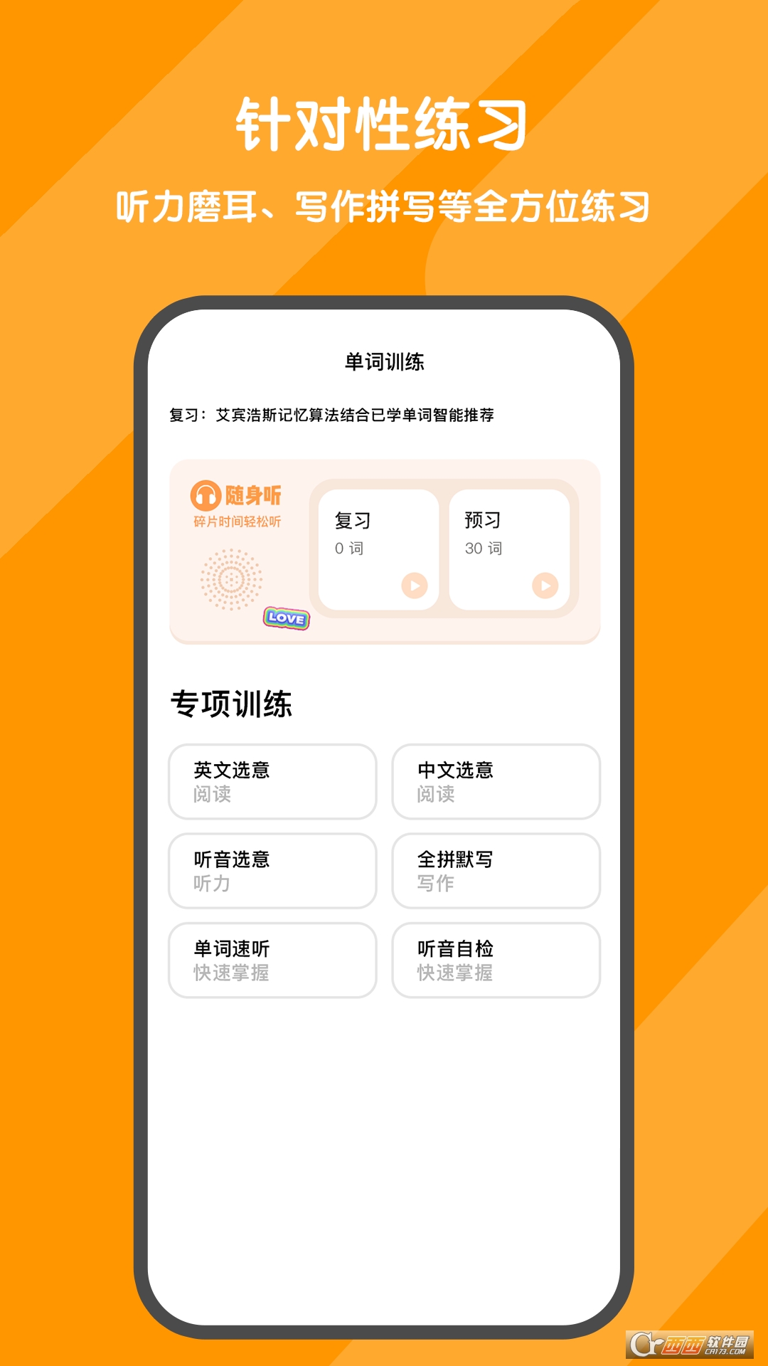 软件基于艾宾浩斯遗忘曲线,自动为用户规划单词的学习和复习时间。在单词即将遗忘的节点推送复习任务,通过多次重复加深记忆,同时搭配不同的记忆题型,让用户从听、说、读、写多个维度掌握单词,记得更牢固。