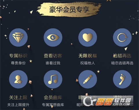 成为会员之后可以享受到的福利有专属的标识、可以查看访客的来访记录,然后可以有无限的祝福功能,选错之后可以再次选择,关注上限提升,可以获得会员的曲库,可以无限次数修改昵称,清除自己到别人的访客记录。