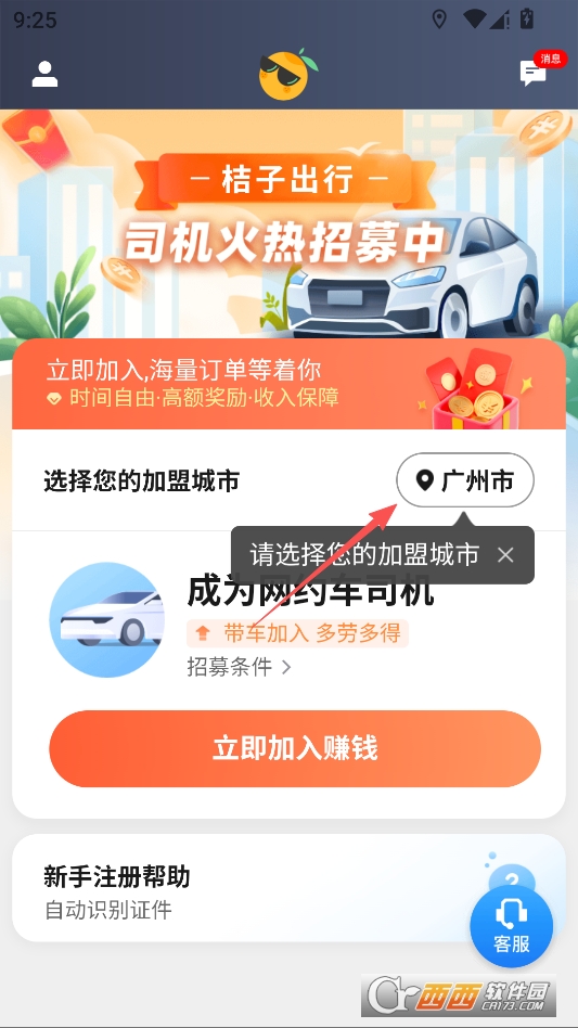 首次进入软件我们来到主页后,要先选择自己加盟的城市所在地