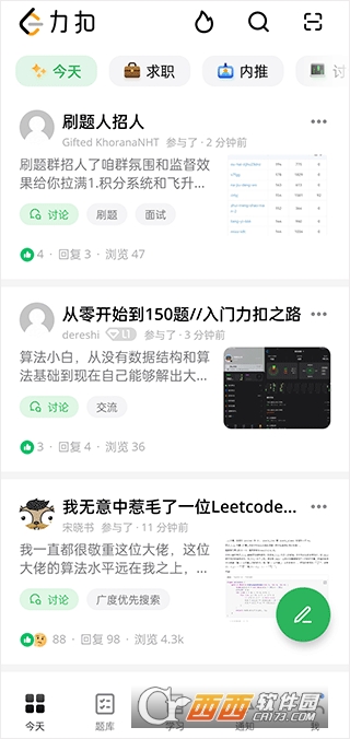 4. 技术社区交流,百万用户在这里分享题解、探讨技术难点、交流职场心得。用户可以发布自己的解题思路,也能借鉴他人的优秀解法,还能参与技术话题讨论,在互动中拓宽视野,提升技术水平。