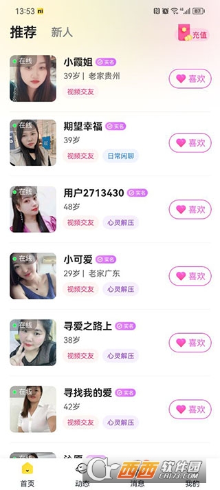 用户登录之后可以进入首页,首页有推荐许多朋友供你选择,而且还有新人朋友可以选择哟!