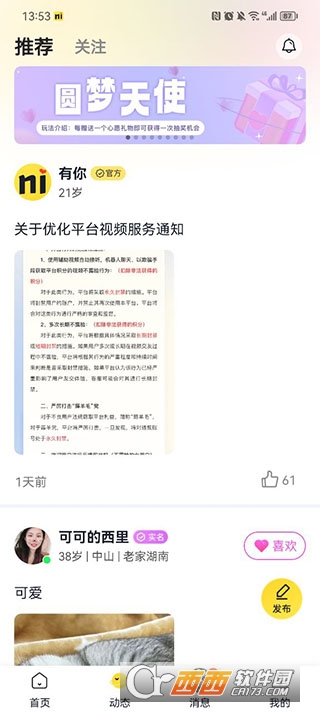 用户点击屏幕下方的动态,可以查看一下推荐朋友发布的动态,对喜欢的内容可以进行点赞关注,也可以查看平台发布的公告,快给喜欢的内容点赞和关注吧!