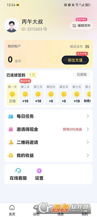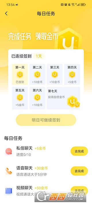 用户进入个人中心可以点击每日任务。进入任务界面,完成任务可以获取金币,金币可以用来聊天和送礼。