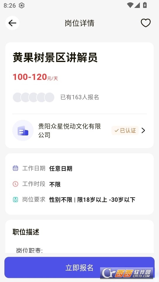 5.在岗位的详情介绍界面当中,点击底部的“立即报名”就可以了