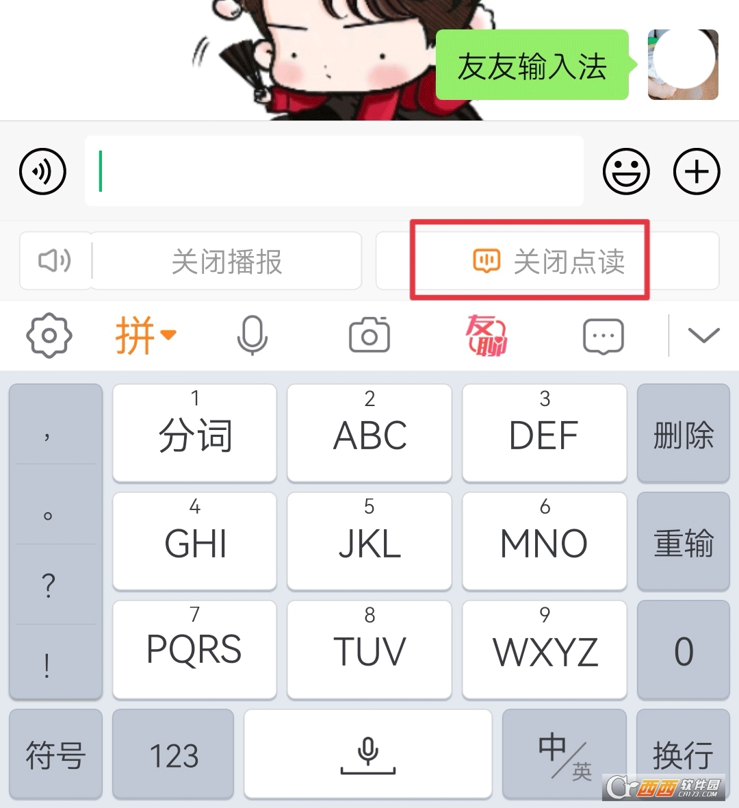 三、语音点读:在输入法键盘界面中点击开启点读,点击后跳转到手机设置并开启友友输入法悬浮窗