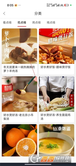 2、在主界面浏览内容点击吃点啥选项,查看萝卜羊肉汤等美食推荐,选择心仪的美食点击进入详情页。