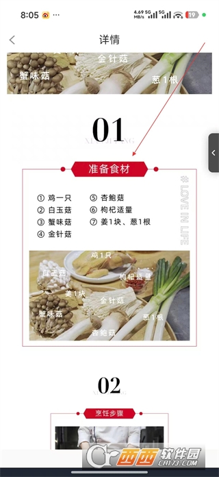 3、在美食详情页点击养生鸡菇汤,再查看烹饪步骤,学习该美食的制作方法。
