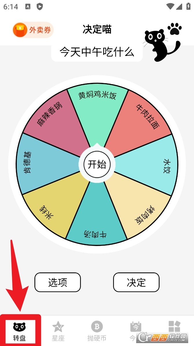 1. 打开 App 后默认进入转盘页面,点击中央“开始”按钮,即可让转盘随机选择一个午餐选项。