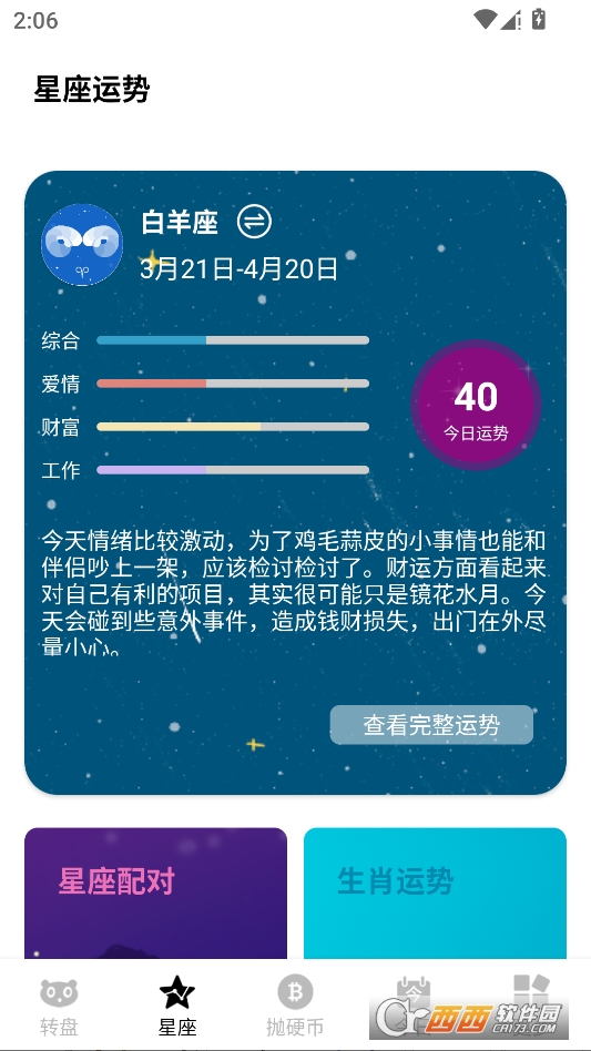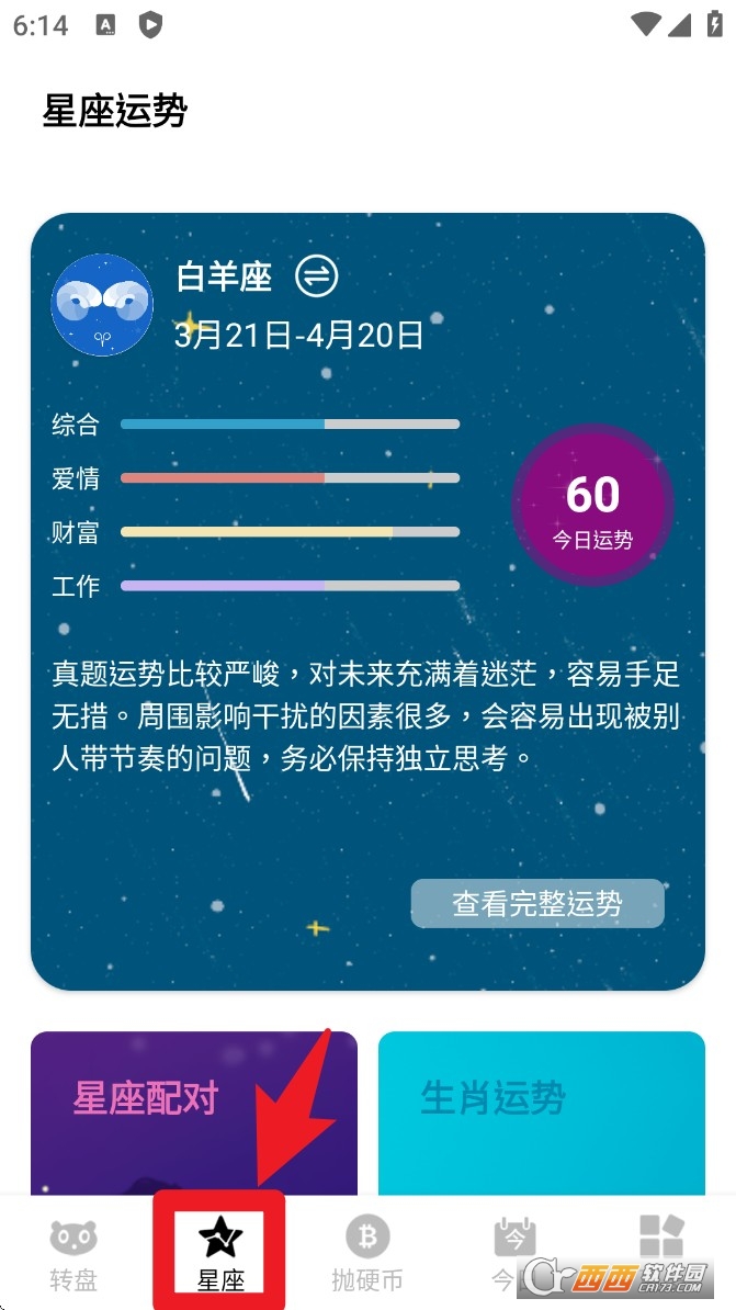 2. 点击底部导航栏的“星座”图标,可查看当日星座运势,还能了解综合、爱情、财富等维度评分。