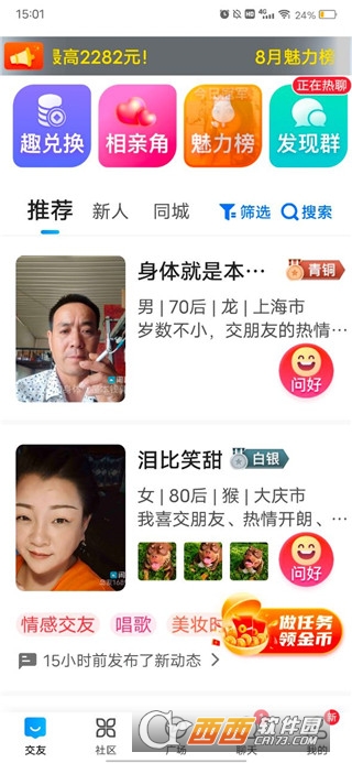 闲趣岛app最新版手机端是一款专为中老年用户打造的在线交友平台,能够根据用户的个人资料,兴趣爱好等条件智能匹配合适的人,还能筛选标签,年龄,城市进行搜索。支持一对一私密聊天,还能进入社区广场,发布图文动态互动,美文美图点赞评论,参与直播间在线互动,更有多种类型的在线互动可以参加,拉进用户之间的社交距离。