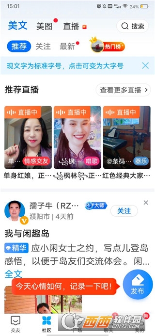 内容形式丰富多元:全面支持文字、图片、短视频、音频、音乐、地理位置定位等多种分享形式,搭配社区热帖、主题直播、兴趣群组等特色模块,内容更新高频且贴近中老年生活,有效避免单一社交形式带来的枯燥感。