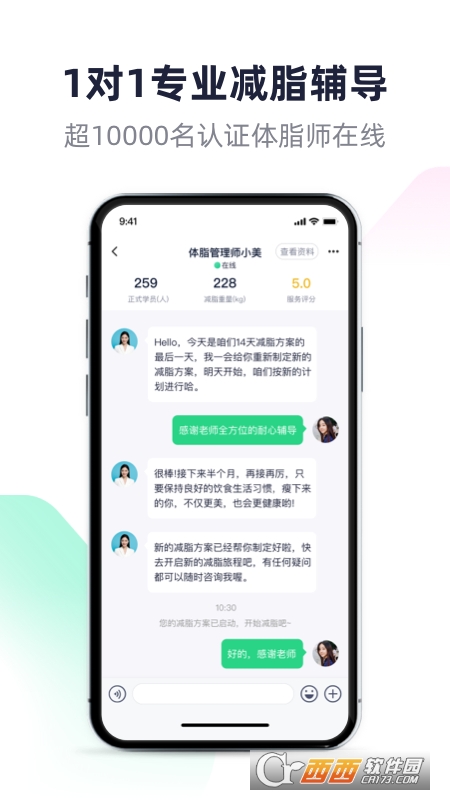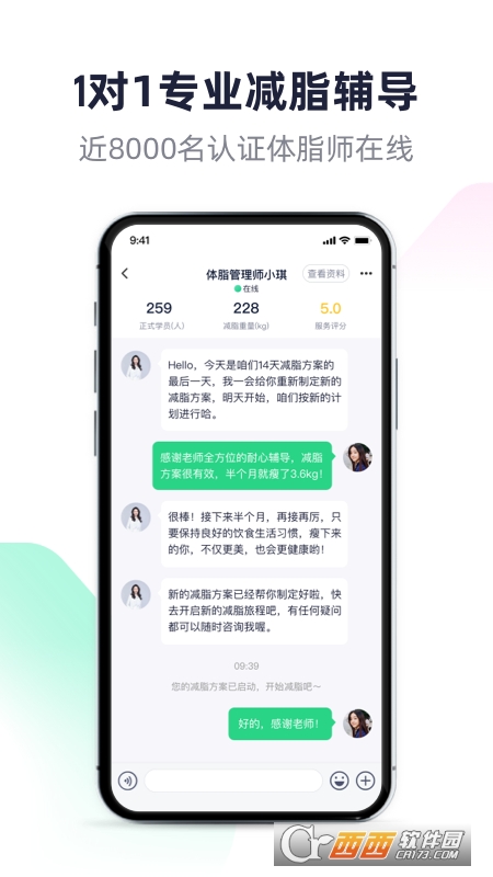 1. 1对1专属减脂辅导,全程专业陪伴。为每位用户匹配专属的专业减脂辅导员,辅导员会根据用户的身体数据和减脂目标,制定个性化的减脂方案。在减脂过程中,辅导员会实时跟进用户进度,解答用户遇到的饮食、运动相关疑问,及时调整方案,帮助用户避开减脂误区。