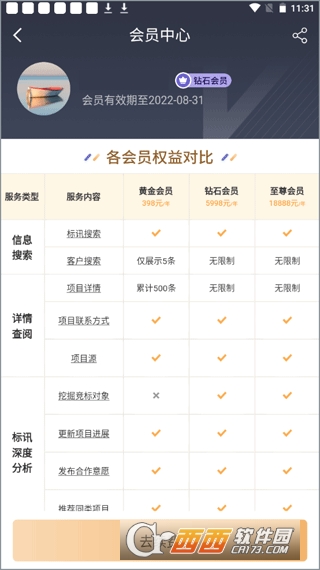 招标雷达的会员可分为四类:黄金会员、铂金会员、钻石会员、至尊会员,不同会员类型对应的权益详情可前往“我的-会员banner(按钮外区域)-会员中心"查看。