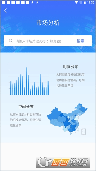 在招标雷达首页点击【市场分析】,输入您想分析的行业关键词,再点击【搜索】,即可得出行业相关采购和中标的时空分布情况。