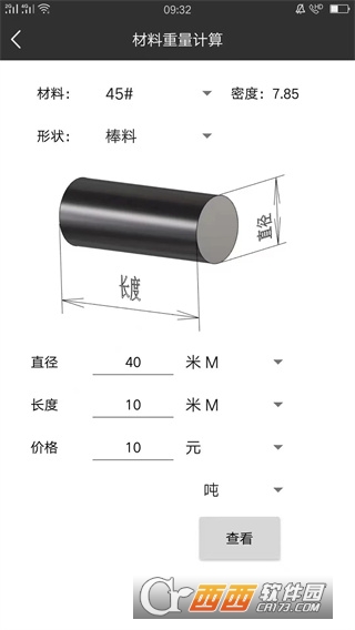 3、点击材料重量则可以进行材料重量计算,输入直径、长度、价格等信息,在点击查看即可。