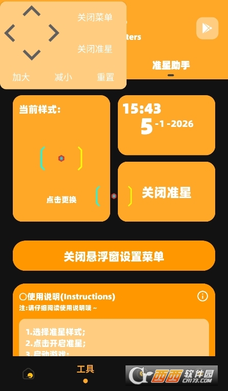 4、长按屏幕中央准星唤出菜单调整大小和位置(长按加大或减小更快调节大小)