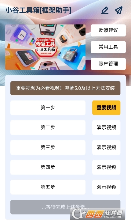 小谷工具箱app2026最新版是一款谷歌工具箱软件,专为华为等安卓手机打造的谷歌框架工具,提供谷歌商城使用功能,支持小伙伴们按步骤安装使用,简洁方便,提供详细的便利操作体验,非常好用,有需要的小伙伴们欢迎来下载试试吧。