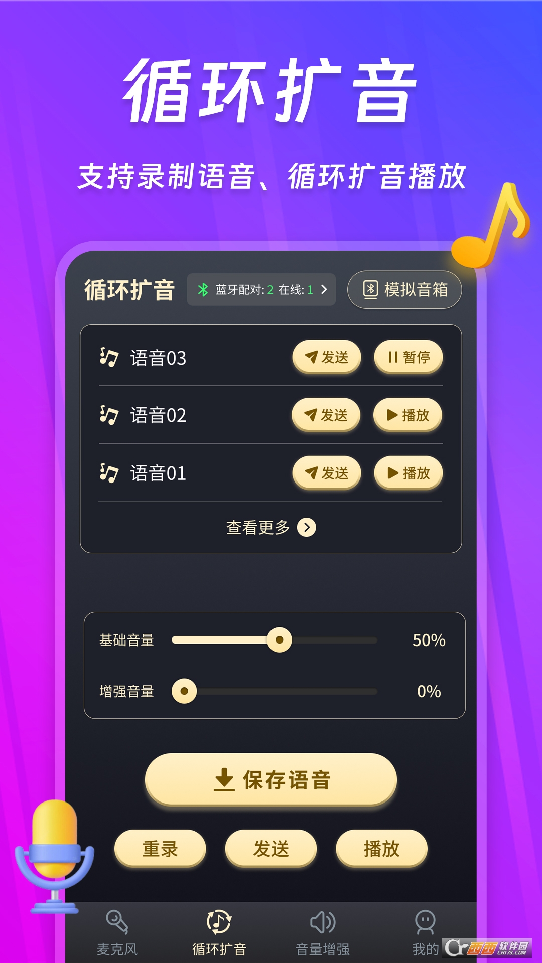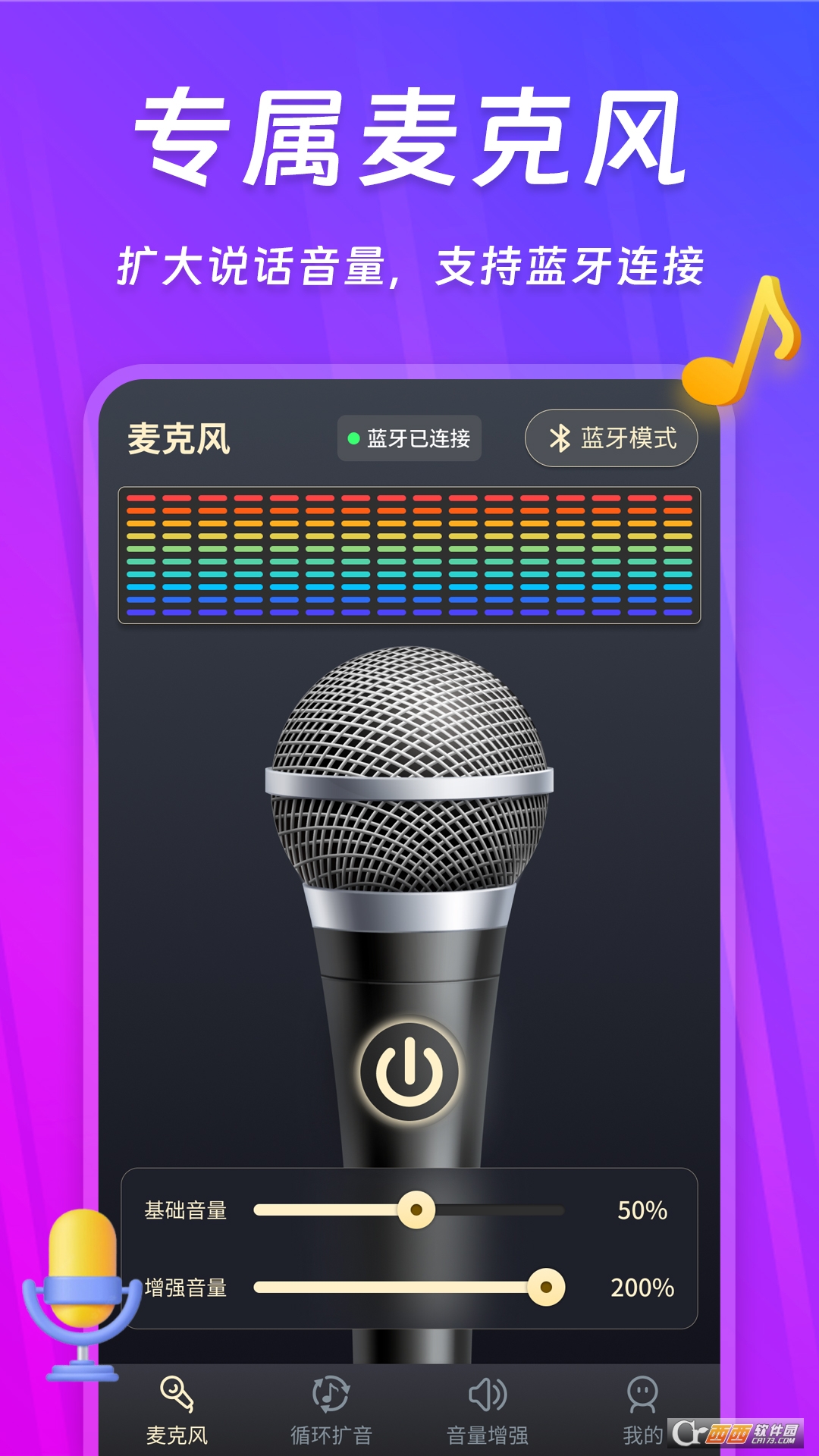 4. 突破系统限制增强音量,畅享大声效。开启音量增强功能后,软件会通过算法优化突破手机系统的音量上限,播放歌曲或扩音时能输出更大的音量。就算在空旷的户外或嘈杂的环境中,也能确保声音足够响亮,同时保持高保真音质,不会出现杂音或失真。