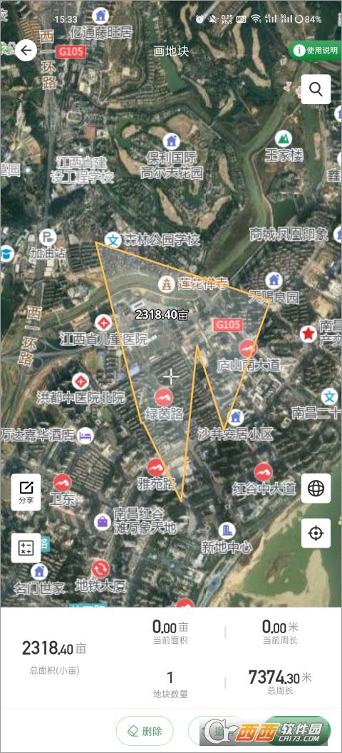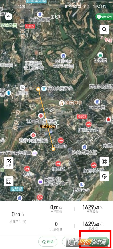 3、移动屏幕自由绘制标点,点击完成,就能得出当前面积和亩数了。