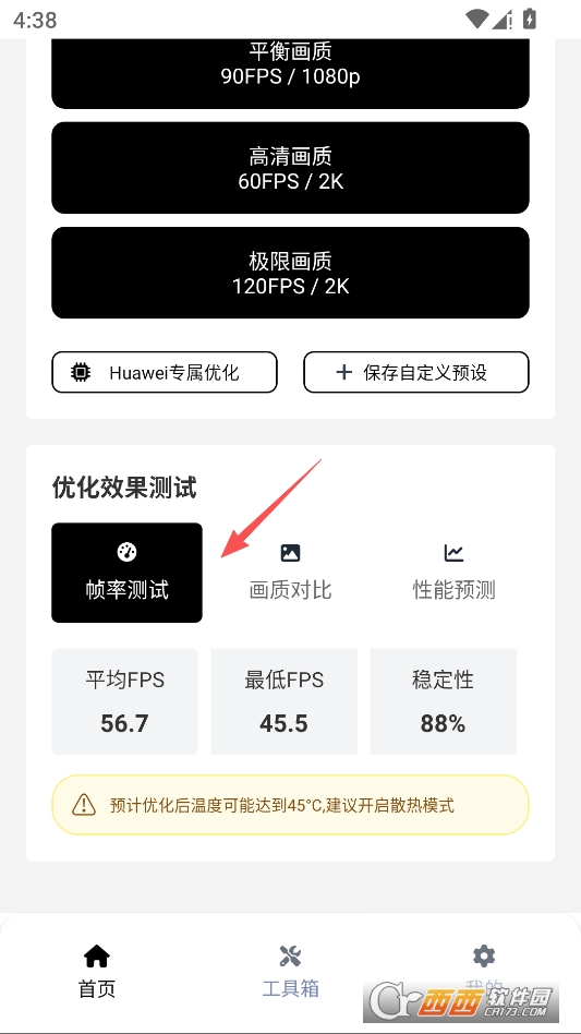 我们首先编辑好自己的游戏辅助器设置,然后回到主页下拉到最下方找到帧率测试选项