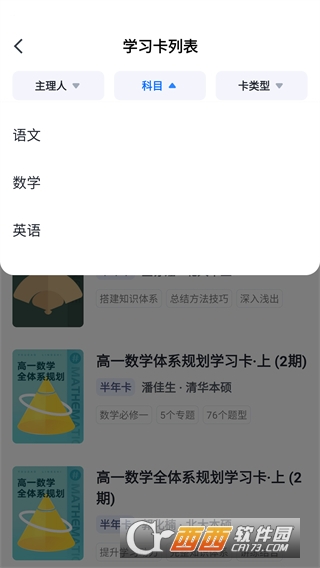 4、在学习卡列表可以选择主理人、科目以及卡类型。