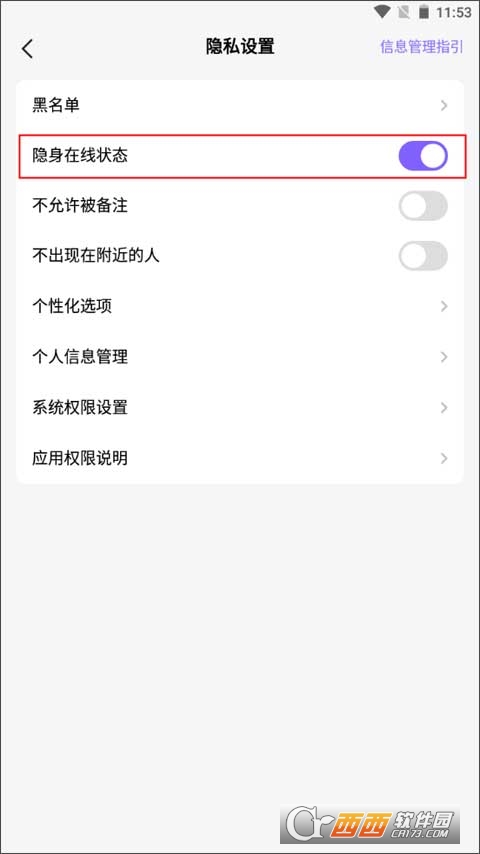 5、在隐私设置界面点击“隐身在线状态”后面的圆点