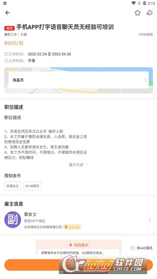 解答:平台有严格的审核机制,所有雇主发布岗位时都需要提交真实的身份信息和用工证明,岗位信息会经过人工核查。同时用户如果遇到虚假岗位,可随时向平台举报,平台会第一时间核实处理,并对违规雇主进行处罚。