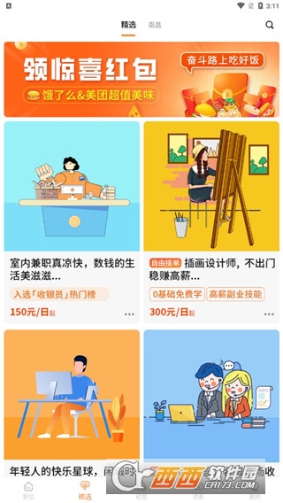 2、进入到精选,在这里有很多无需出门就可以工作的兼职,闲暇时期也可以赚钱;